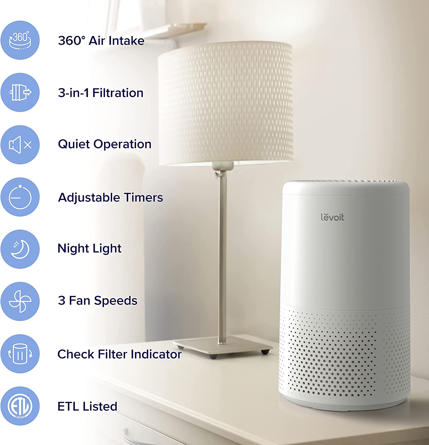LEVOIT Air Purifier for Household Allergies and Pet Hair, H13 True HEPA Filter, Silent Filtration System for Bedrooms, Removes Wildfire Smoke Smells Dust Mildew, Night Light and Timer, Vista 200, White